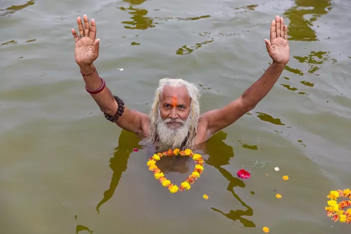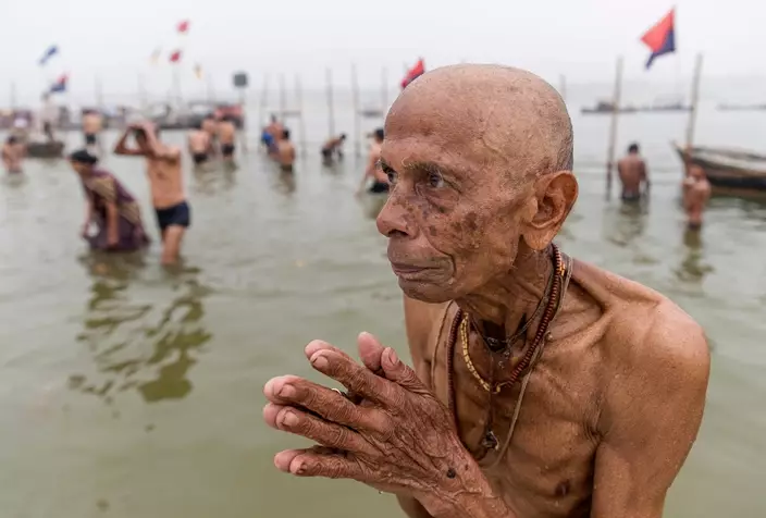 A Hindu holy man offers prayers after taking ritualistic dips at "Sangam," the meeting point of Indian holy rivers the Ganges and the Yamuna, on the auspicious day of "Paush Purnima" during the annual traditional fair of Magh Mela in Allahabad, India, Tuesday, Jan. 2, 2018. (AP Photo/Rajesh Kumar Singh)