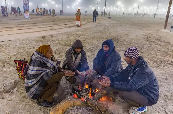 Indian Hindu devotees warm themselves around a bonfire after taking ritualistic dips at "Sangam," the meeting point of Indian holy rivers the Ganges and the Yamuna, on the auspicious day of "Paush Purnima" during the annual traditional fair of Magh Mela in Allahabad, India, Tuesday, Jan. 2, 2018. (AP Photo/Rajesh Kumar Singh)