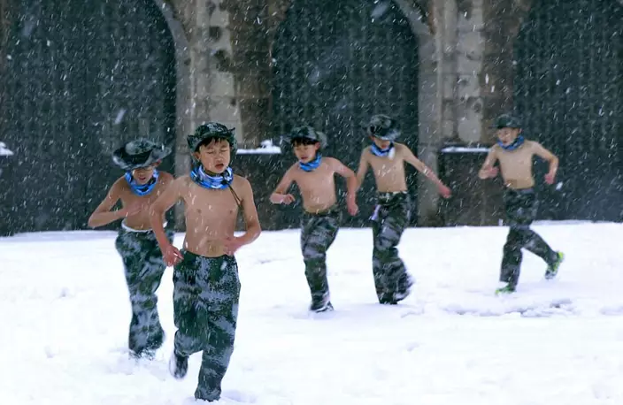 A group of 13 children run in heavy snow topless during a winter boot camp organised by the 'Eagle Dad' in Nanjing, China(Imaginechina/REX/Shutterstock)