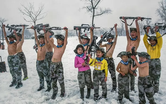 Boys and girls as young as four hold toy guns as they cheer during the winter boot camp aimed to sharpen their will. (Imaginechina/REX/Shutterstock)