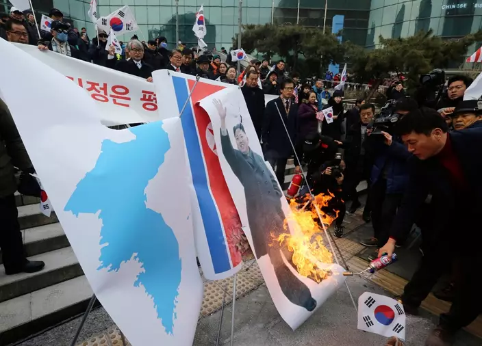 South Korean protesters burn a portrait of North Korean leader Kim Jong Un during a rally against a visit of North Korean Hyon Song Wol, head of North Korea's art troupe, in front of Seoul Railway Station in Seoul, South Korea, Monday, Jan. 22, 2018. (AP Photo/Ahn Young-joon)