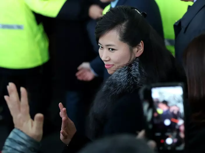 FILE - In this Sunday, Jan. 21, 2018, file photo, North Korean Hyon Song Wol, head of North Korea's art troupe, waves as she arrives at the Gangneung Railway Station in Gangneung, South Korea. (Kim In-chul/Yonhap via AP, File)