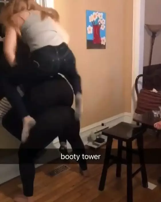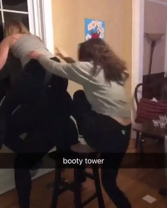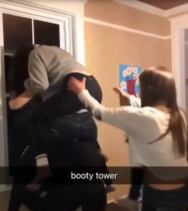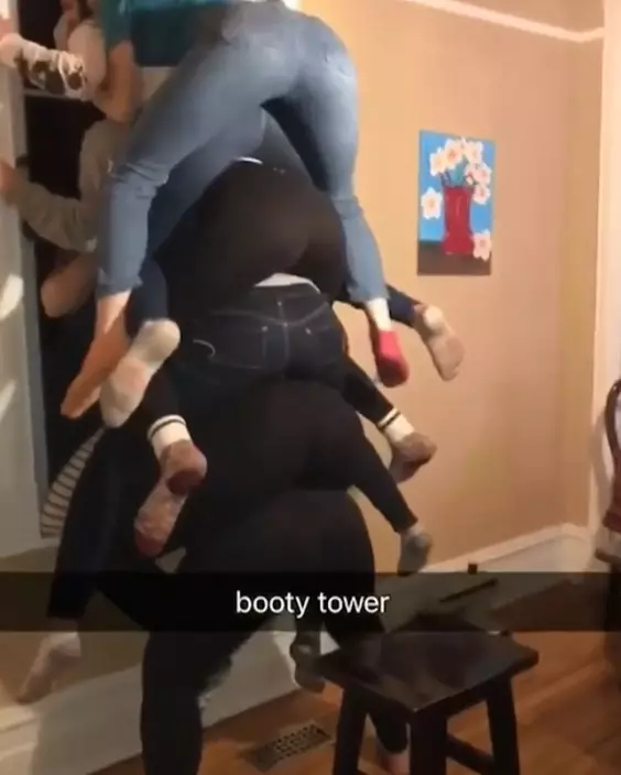 The video showed six girls made a stack by riding on butts one by one, trying to build a "booty tower." Yes, this is what they called.