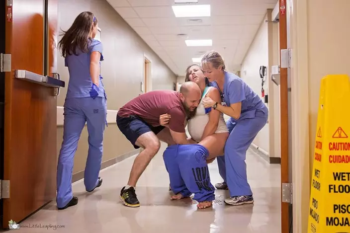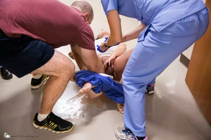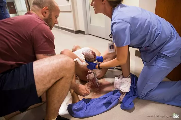 Jes could feel the baby was coming when she almost arrived to the hospital, so started screaming. There was nobody around to help them at first but the situation was really urgent, so Jes took off her pants and delivered on the floor.