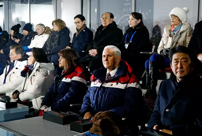 Vice President Mike Pence, second from bottom right, sits between second lady Karen Pence, third from from bottom left, and Japanese Prime Minister Shinzo Abe at the opening ceremony of the 2018 Winter Olympics in Pyeongchang, South Korea, Friday, Feb. 9, 2018. Seated behind Pence are Kim Yong Nam, third from top right, president of the Presidium of North Korean Parliament, and Kim Yo Jong, second from top right, sister of North Korean leader Kim Jong Un. (AP Photo/Patrick Semansky, Pool)