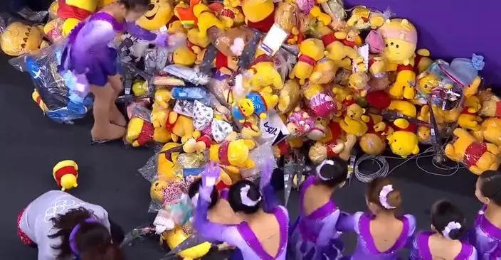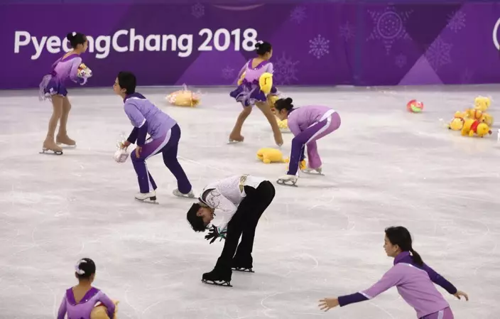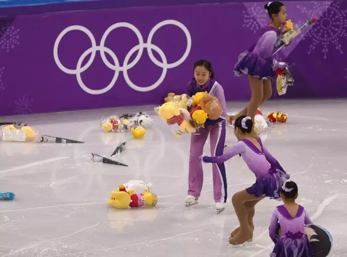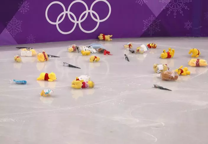 After Yuzuru Hanyu managed to retain his championship title on Saturday (February 17), the ice was covered with Pooh Bear again and it took at least 20 sweepers to collect all the dolls.