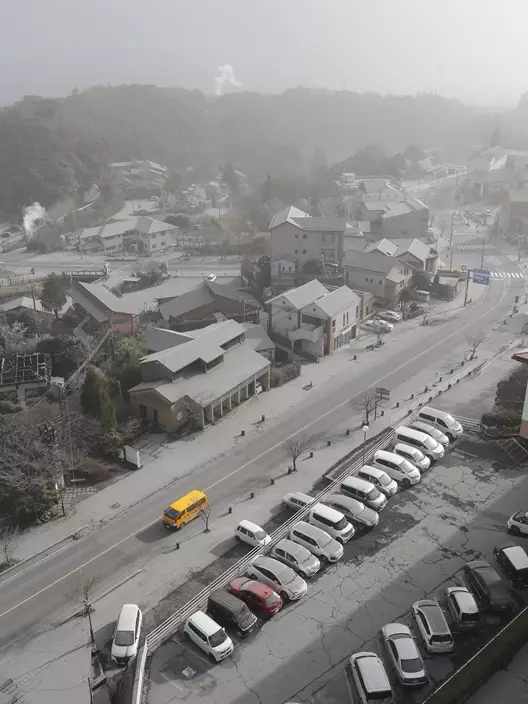 In Kirishima city at the foot of the volcano, pedestrians wore surgical masks or covered their noses with hand towels, while others used umbrellas to protect from falling ash. Cars had layers of ash on their roofs.