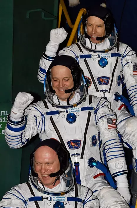 A Soyuz rocket carrying the three men blasted off Wednesday from the Russia-leased Baikonur launch pad in Kazakhstan. On board the capsule were NASA astronauts Drew Feustel and Ricky Arnold, and Roscosmos' cosmonaut Oleg Artemyev.