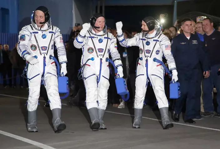 U.S. astronauts Andrew Feustel, top, and Richard Arnold, and Russian cosmonaut Oleg Artemyev members of the main crew of the expedition to the International Space Station (ISS), wave near the rocket prior the launch of Soyuz MS-08 space ship at the Russian leased Baikonur cosmodrome, Kazakhstan, Wednesday, March 21, 2018. (Vyacheslav Oseledko/Pool Photo via AP)