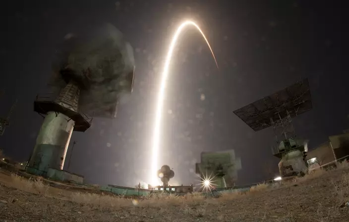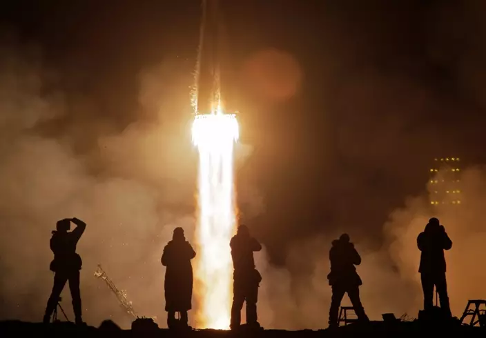 The Soyuz-FG rocket booster with Soyuz MS-08 space ship carrying a new crew to the International Space Station, ISS, blasts off at the Russian leased Baikonur cosmodrome, Kazakhstan, Wednesday, March 21, 2018. The Russian rocket carries Russian cosmonaut Oleg Artemyev, and U.S. astronauts Richard Arnold and Andrew Feustel. (AP Photo/Dmitri Lovetsky)