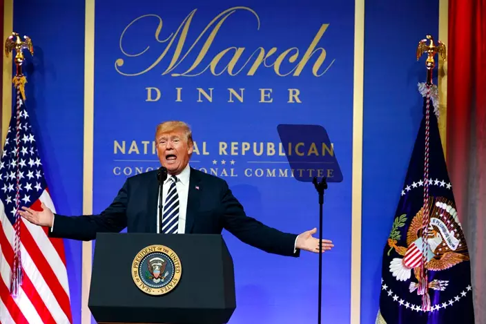 In this March 20, 2018 photo, President Donald Trump speaks to the National Republican Congressional Committee March Dinner at the National Building Museum in Washington. (AP Photo/Evan Vucci)