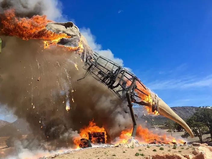 In a Thursday, March 22, 2018 photo provided by the Royal Gorge Dinosaur Experience, a life-sized animatronic Tyrannosaurus Rex at the Royal Gorge Dinosaur Experience in Canon City, Colo., is ablaze after an electrical issue, according to Royal Gorge Dinosaur Experience personnel. (Royal Gorge Dinosaur Experience via AP)