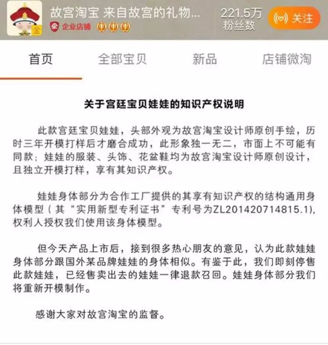 The official Taobao store of the museum published a statement on their homepage, saying that the dolls were pulled off the shelves because “the body of the doll resembles the product of a certain foreign brand.”