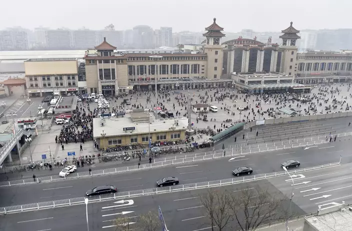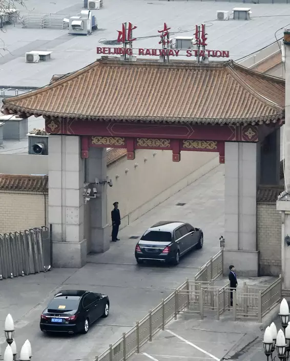 A motorcade, foreground, arrives at Beijing Railway Station in Beijing Tuesday, March 27, 2018. Speculation about a visit to Beijing by North Korean leader Kim Jong Un or another high-level Pyongyang official was running high Tuesday amid talk of preparations for a meeting between the North's reclusive leader and President Donald Trump. (Kyodo News via AP)