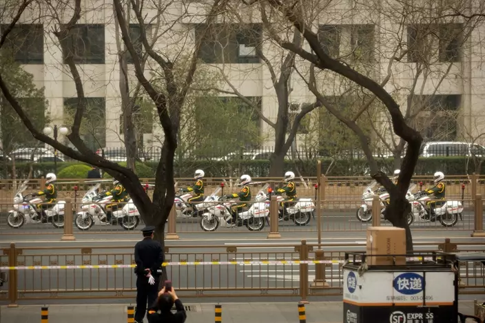 Motorcycles escort a motorcade along Chang'an Avenue, a major east-west thoroughfare in Beijing, Tuesday, March 27, 2018. Speculation about a visit to Beijing by North Korean leader Kim Jong Un or another high-level Pyongyang official was running high Tuesday amid talk of preparations for a meeting between the North's reclusive leader and President Donald Trump. (AP Photo/Mark Schiefelbein)