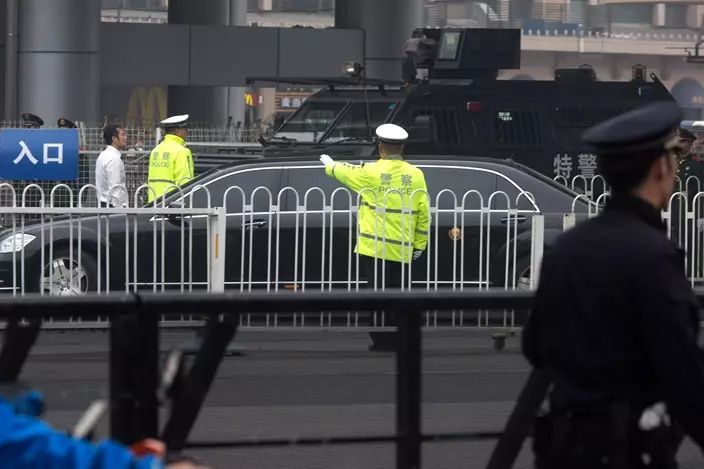 A limousine without car plates and bearing a gold color emblem on its side arrives amid heavy security at the train station in Beijing, China, Tuesday, March 27, 2018. The activity followed the arrival Monday of a train resembling one used by North Korea's previous leader, and a foreign guesthouse in Beijing had a heavy security presence overnight. Some media have speculated that North Korean leader Kim Jong Un was making a surprise visit to China. (AP Photo/Ng Han Guan)