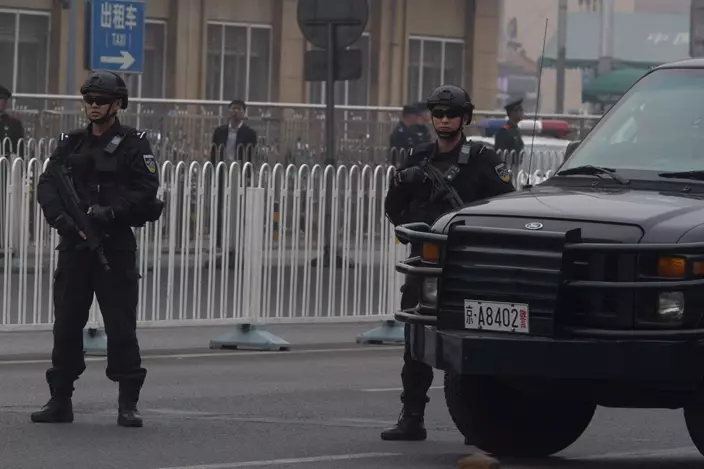 Heavily armed police guard an area outside a train station ahead of the arrival of a convoy in Beijing, China, Tuesday, March 27, 2018. The activity followed the arrival Monday of a train resembling one used by North Korea's previous leader, and a foreign guesthouse in Beijing had a heavy security presence overnight. Some media have speculated that North Korean leader Kim Jong Un was making a surprise visit to China. (AP Photo/Ng Han Guan)