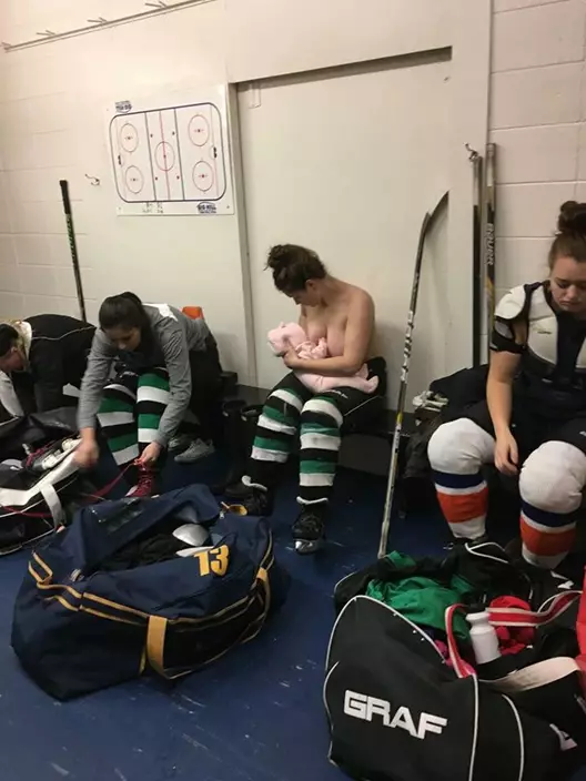 Serah Small, a hockey player and teacher shared an amazing photo of her breastfeeding her two months old baby between periods of her hockey game.