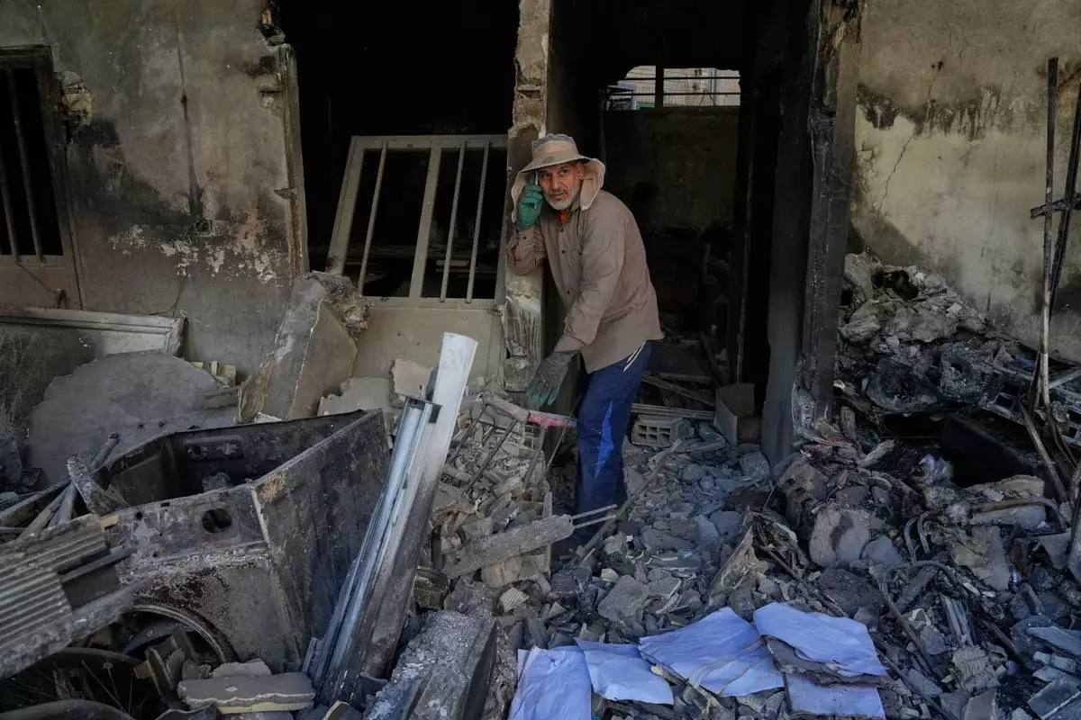 A volunteer talks on his phone while walking amid the debris of a residential building that, according to the authorities, was damaged on March 4 during the U.S.-Israeli military campaign, in southeastern Tehran, Iran, Tuesday, April 14, 2026. (AP Photo/Vahid Salemi)