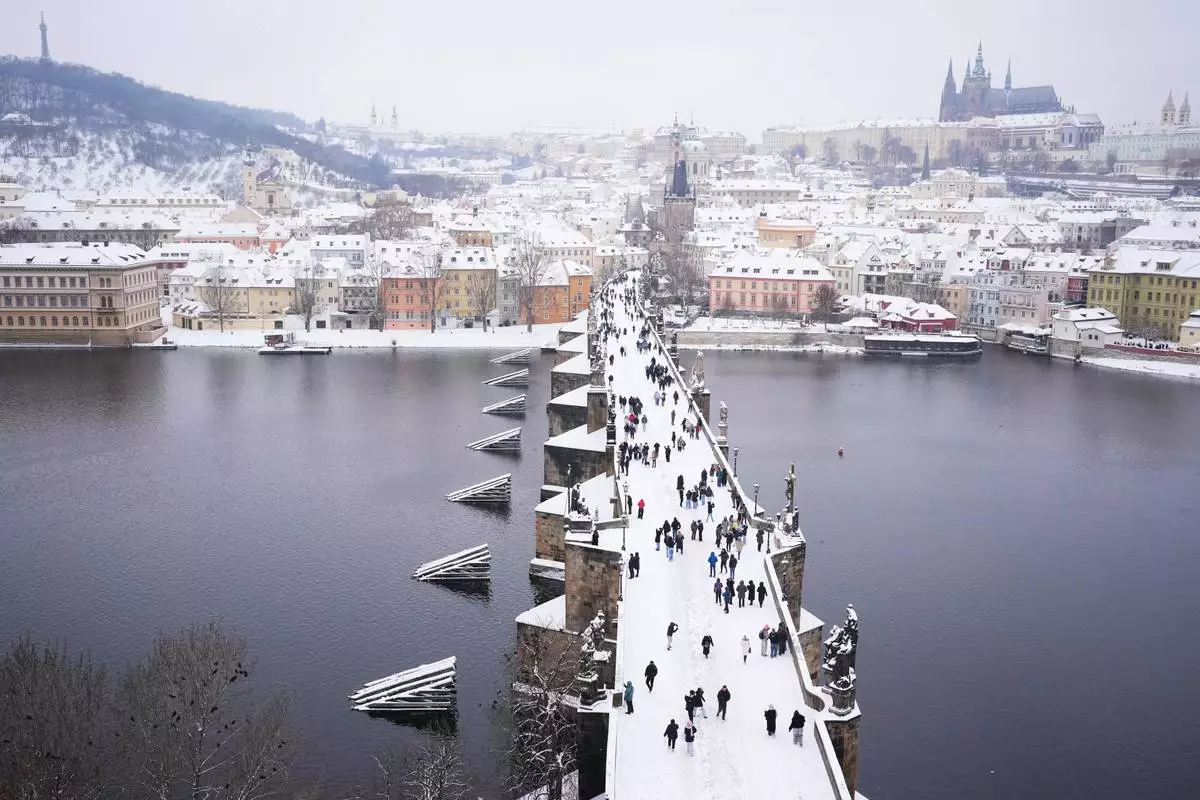 People cross the medieval Charles Bridge after a heavy snowfall in Prague, Czech Republic, Friday, Jan. 9, 2026. (AP Photo/Petr David Josek)