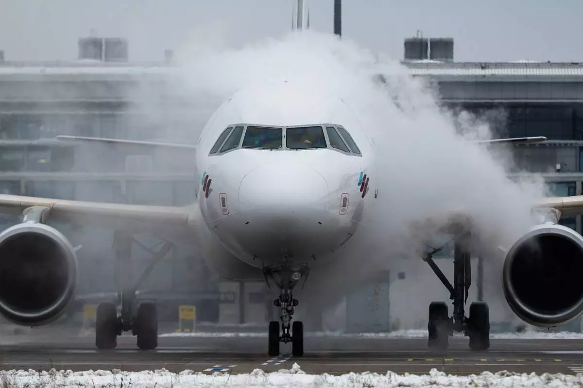 A Eurowings aircraft is de-iced at Berlin-Brandenburg Airport, Germany, Friday Jan. 9, 2026. (Christophe Gateau/dpa via AP)