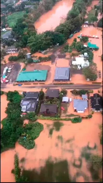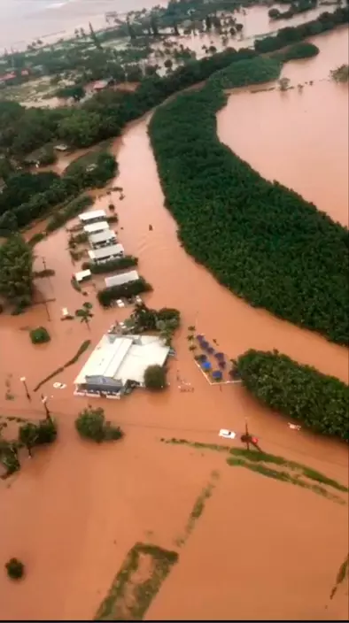 This image taken from video provided by the U.S. Coast guard shows flooding in Kauai's Hanalei Bay, Hawaii, Sunday, April 15, 2018. Hawaii Gov. David Ige issued an emergency proclamation for the island where heavy rainfall damaged or flooded dozens of homes in Hanalei, Wainiha, Haena and Anahola. (Petty Officer 3rd Class Brandon Verdura/U.S. Coast Guard via AP)