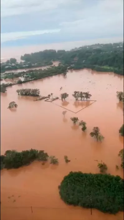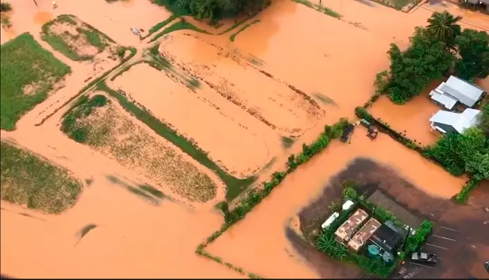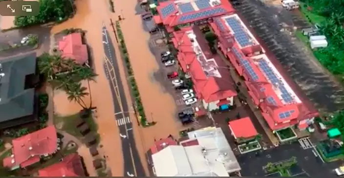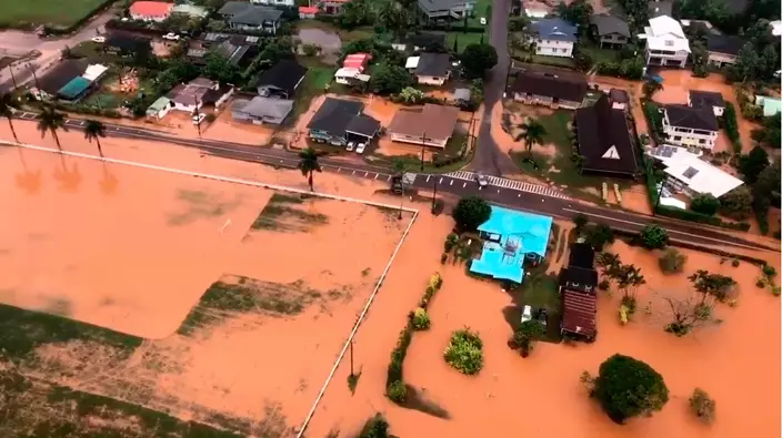This Sunday, April 15, 2018 image taken from video provided by the U.S. Coast Guard shows flooding along Kauai's Hanalei Bay, Hawaii. Hawaii Gov. David Ige issued an emergency proclamation for the island where heavy rainfall damaged or flooded dozens of homes in Hanalei, Wainiha, Haena and Anahola. (Petty Officer 3rd Class Brandon Verdura/U.S. Coast Guard via AP)