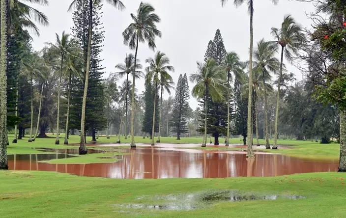In this Sunday, April 15, 2018 photo, water floods the the Wailua Golf Course in Lihue, Hawaii, forcing the closure of the nearby Kuhio Highway. (Dennis Fujimoto/The Garden Island via AP)