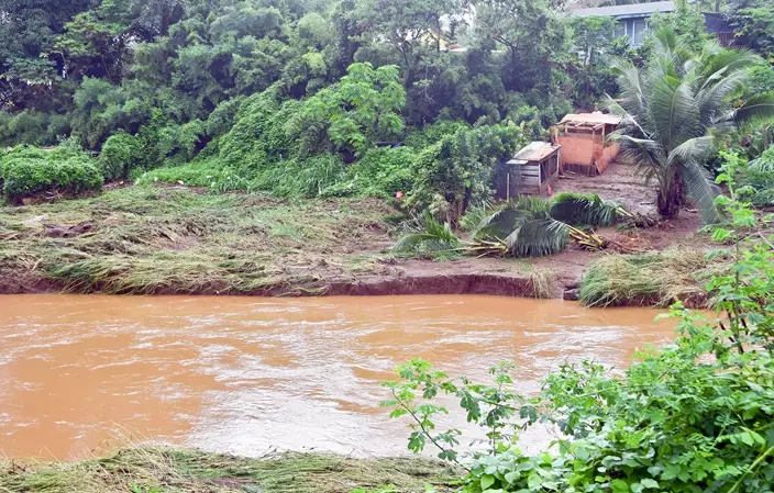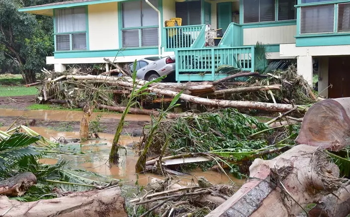 In this Sunday, April 15, 2018 photo, Kelii Kinney checks on his flood damage property in Anahola, Hawaii, after the Anahola River broke its banks in the pre-dawn hours and flooded the community downstream. (Dennis Fujimoto/The Garden Island via AP)