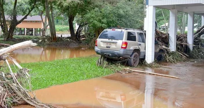 Jeff Culverhouse, manager and partner of a Hanalei strip mall, was wishing for a hot shower as he pumped water out of elevators Monday. Every shop in the mall had 4 to 6 inches (10.16 to 15.24 centimeters) of water and thick mud, he said, though the Big Save Market was open.