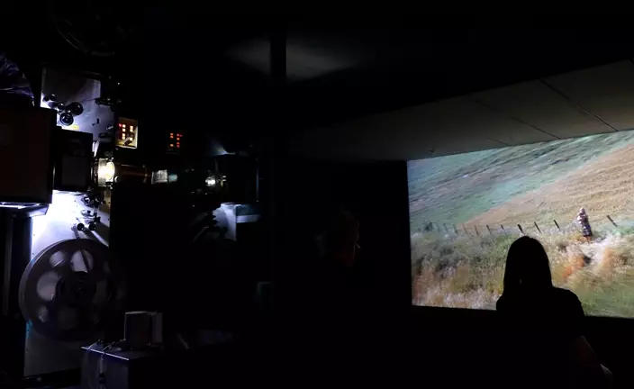 In this March 15, 2018 photo, a woman watches a 70mm film by French contemporary artist Philippe Parreno that is part of the exhibit, "The Train: RFK's Last Journey," at the San Francisco Museum of Modern Art in San Francisco. (AP Photo/Eric Risberg)