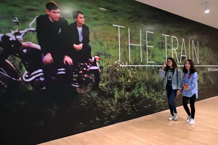 In thisMarch 15, 2018 photo, two women walk past a mural of a Paul Fusco photograph that is part of the exhibit, "The Train: RFK's Last Journey," at the San Francisco Museum of Modern Art in San Francisco. (AP Photo/Eric Risberg)