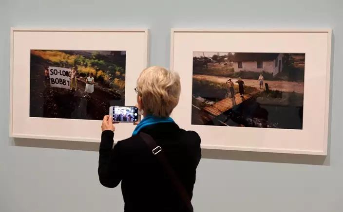 In this March 15, 2018 photo, a woman views a pair of Paul Fusco photographs that are part of the exhibit, "The Train: RFK's Last Journey," at the San Francisco Museum of Modern Art in San Francisco. (AP Photo/Eric Risberg)