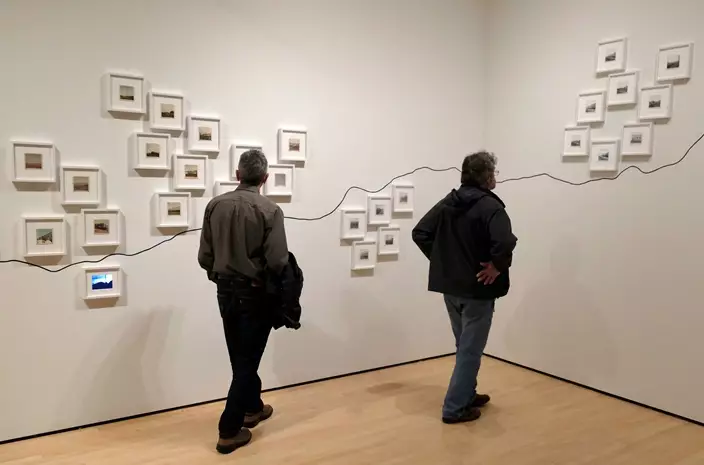 In this March 15, 2018 photo, two men look at the conceptual project "The People's View" by Dutch artist Rein Jelle Terpstra that is part of the exhibit, "The Train: RFK's Last Journey," at the San Francisco Museum of Modern Art in San Francisco. The photographs taken by bystanders, are arranged on the wall by where they were taken on the route from New York City to Washington. (AP Photo/Eric Risberg)