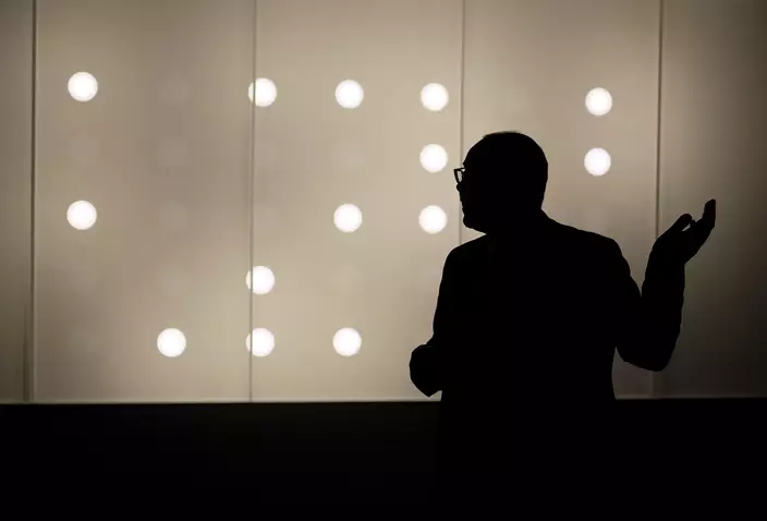 In this March 15, 2018 photo, Clement Cheroux, senior curator for photography, gestures while speaking about a 70mm film by French contemporary artist Philippe Parreno that is part of the exhibit, "The Train: RFK's Last Journey," at the San Francisco Museum of Modern Art in San Francisco. (AP Photo/Eric Risberg)