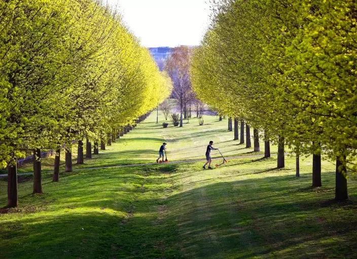 FILE - In this April 11, 2018, file photo, two boys push their scooters through a park with green blossoming trees in Frankfurt, Germany. (AP Photo/Michael Probst, File)