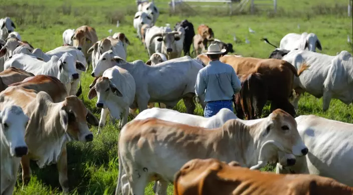FILE - In this Sept. 22, 2017, file photo, John Locke works to move a herd to another field at his family's ranch in Glen Flora, Texas. (AP Photo/Eric Gay, File)