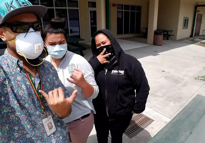 In this Wednesday, May 23, 2018 photo provided by teacher Aina Akamu, Akamu, at left, takes a photo with his students, Shyann Tamura, center, and Shyanne Akiona, right, at their school campus in Pahala, Hawaii. Kau High and Pahala Elementary School were covered in ash that spewed out of a Hawaii volcano explosion and drifted down into their small and rural town. School officials have been handing out ash-filtering face masks. (Aina Akamu via AP)
