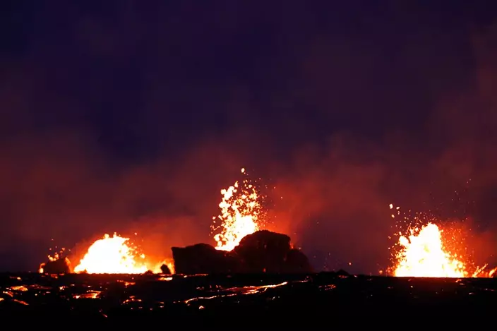 In this May 24, 2018 photo from the Federal Emergency Management Agency, lava erupts from a fissure in the Leilani Estates neighborhood near Pahoa on the island of Hawaii. Three lava flows from eruptions of Kilauea volcano are now flowing into the ocean off Hawaii's Big Island. Hawaii County officials say the third flow started pouring into the sea Thursday. Lava is spewing from a fissure in a rural community that's feeding the two other flows that are reaching the waves. (Grace Simoneau/FEMA via AP)