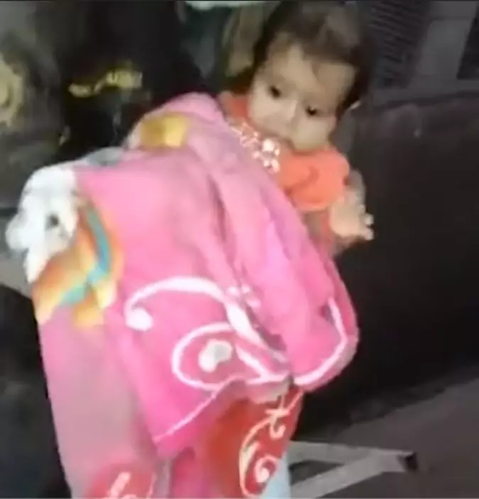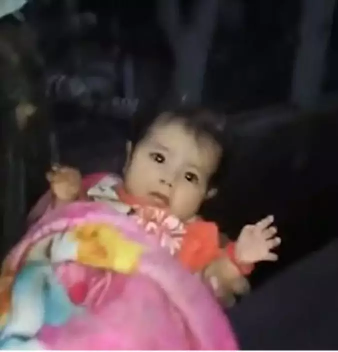 The baby can be seen unharmed when the hero picks her up in the chaos.