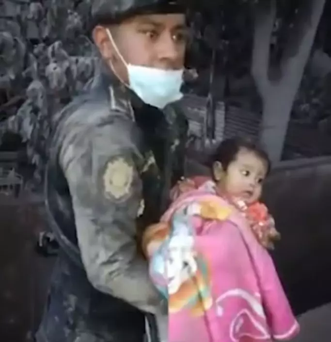 A touching moment has been captured when a police officer saved a baby in a building from ash after a volcanic eruption in Guatemala.