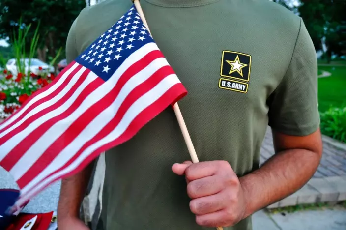 In this Tuesday, July 3, 2018, photo, a Pakistani recruit, 22, who was recently discharged from the U.S. Army, holds an American flag as he poses for a picture. (AP Photo/Mike Knaak)
