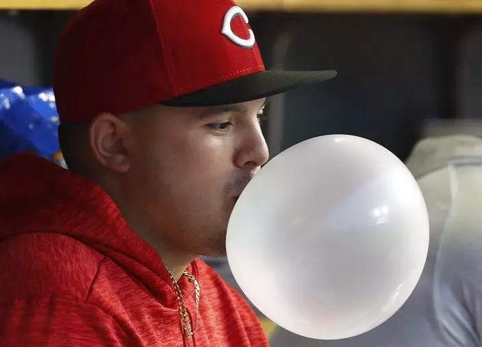 Cincinnati Reds pitcher Sal Romano blows a bubble with gum in the dugout during the fourth inning of the team's baseball game against the Detroit Tigers in Detroit, Tuesday, July 31, 2018. (AP PhotoPaul Sancya)
