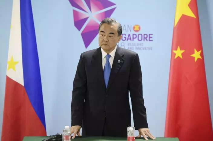FILE - In this Thursday, Aug. 2, 2018, file photo, China's Foreign Minister Wang Yi pauses before a bilateral meeting with Philippines' Foreign Affairs Secretary Alan Cayetano on the sidelines of the 51st ASEAN Foreign Ministers Meeting in Singapore. Recent developments in the South China Sea leave China pitted against smaller neighbors in disputes over territorial rights in waters crucial for global commerce and rich in fish and potential oil and gas reserves. (AP PhotoJoseph Nair, File)