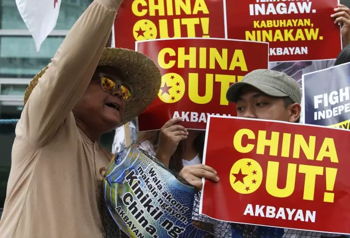 FILE - In this Monday, June 11, 2018, file photo, protesters shout slogans during a rally to protest the alleged continued seizure of catches of Filipino fishermen at a disputed shoal in the South China Sea in Manila, Philippines. Recent developments in the South China Sea leave China pitted against smaller neighbors in disputes over territorial rights in waters crucial for global commerce and rich in fish and potential oil and gas reserves. (AP PhotoBullit Marquez, File)