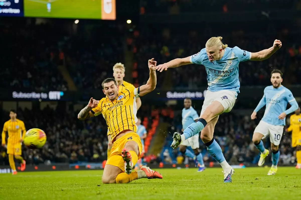 Manchester City's Erling Haaland, right, attempts a shot at goal in front of Brighton's Lewis Dunk during the English Premier League soccer match between Manchester City and Brighton and Hove Albion in Manchester, England, Wednesday, Jan. 7, 2026. (AP Photo/Dave Thompson)