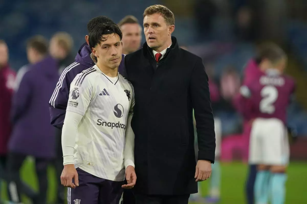 Manchester United's interim manager Darren Fletcher and Lisandro Martinez walk off the pitch after the Premier League soccer match between Burnley and Manchester United in Burnley, England Wednesday, Jan. 7, 2026. (AP Photo/Ian Hodgson)