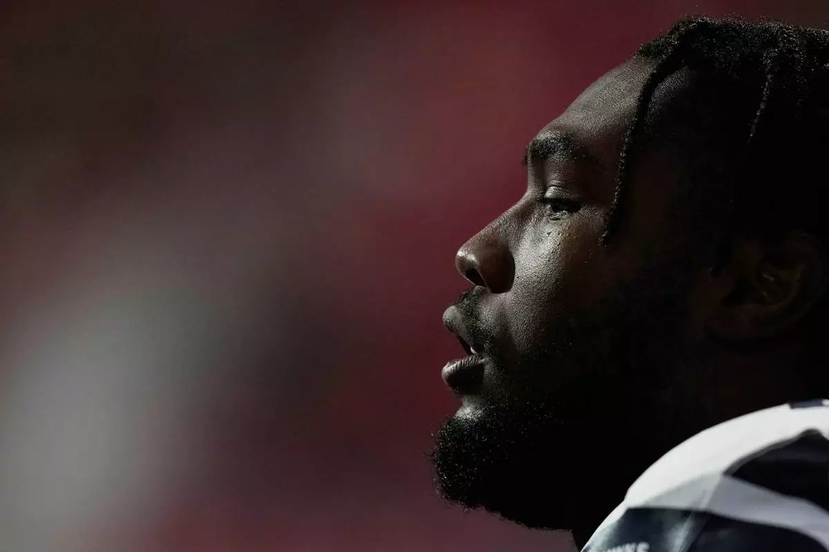 Seattle Seahawks offensive tackle Charles Cross looks on before an NFL football game against the Atlanta Falcons, Sunday, Dec. 7, 2025, in Atlanta. (AP Photo/Brynn Anderson)