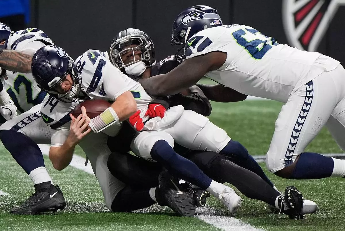Atlanta Falcons linebacker James Pearce Jr. sacks Seattle Seahawks quarterback Sam Darnold as offensive tackle Charles Cross, right, tries to pull him away during the first half of an NFL football game, Sunday, Dec. 7, 2025, in Atlanta. (AP Photo/Mike Stewart)