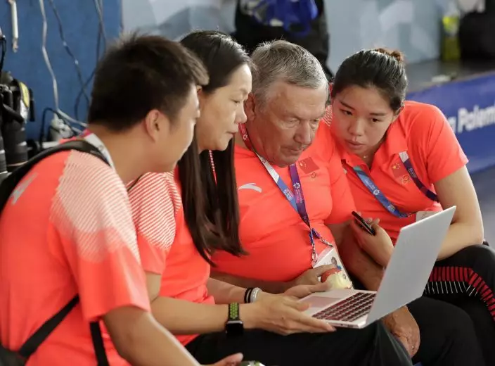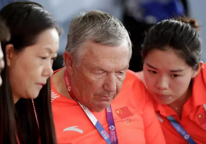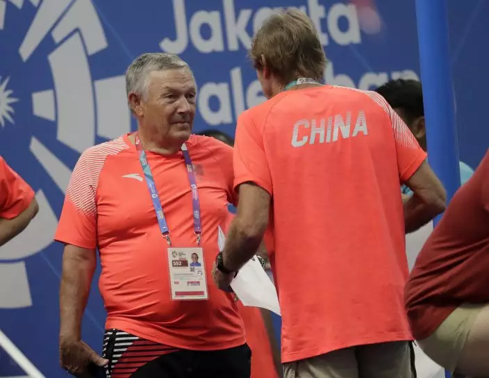Mark Schubert former USA Swimming's National Team head coach, works on the pool deck with Chinese swim team members at the 18th Asian Games in Jakarta, Indonesia, Wednesday, Aug. 22, 2018. Dismissed in 2010 as the American head coach, Schubert has been working for a year as a "part-time adviser" for the Chinese team. (AP PhotoLee Jin-man)